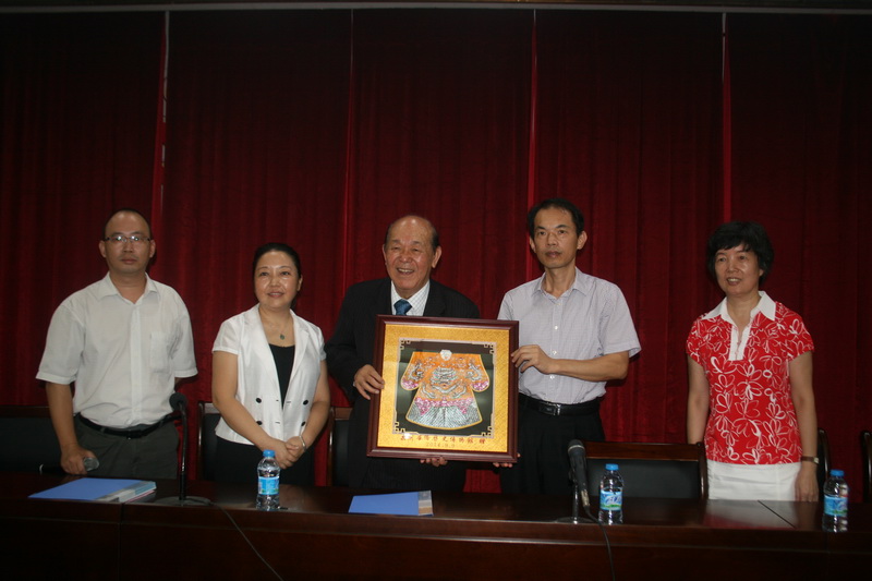 陈海涛副主席(右)向吴德芳先生赠送“掌中木偶龙袍”展品